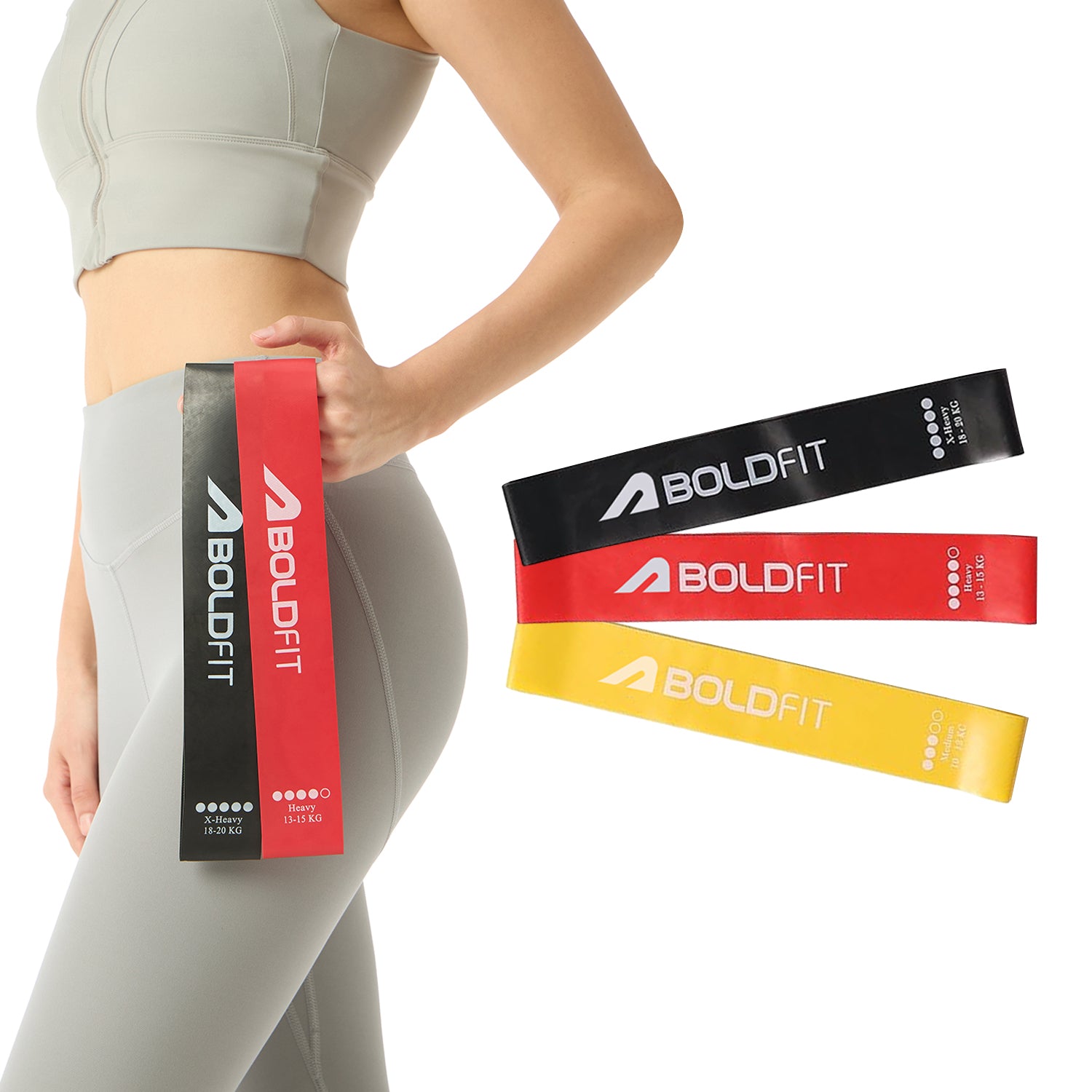 Boldfit resistance bands are made from high-quality, durable, and skin-friendly natural latex, ensuring elasticity, longevity, and safe use during workouts.